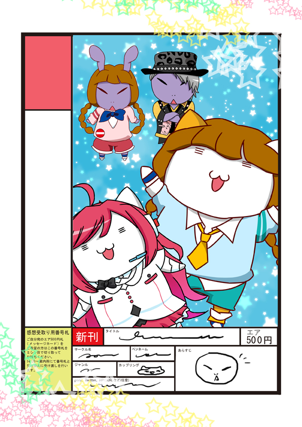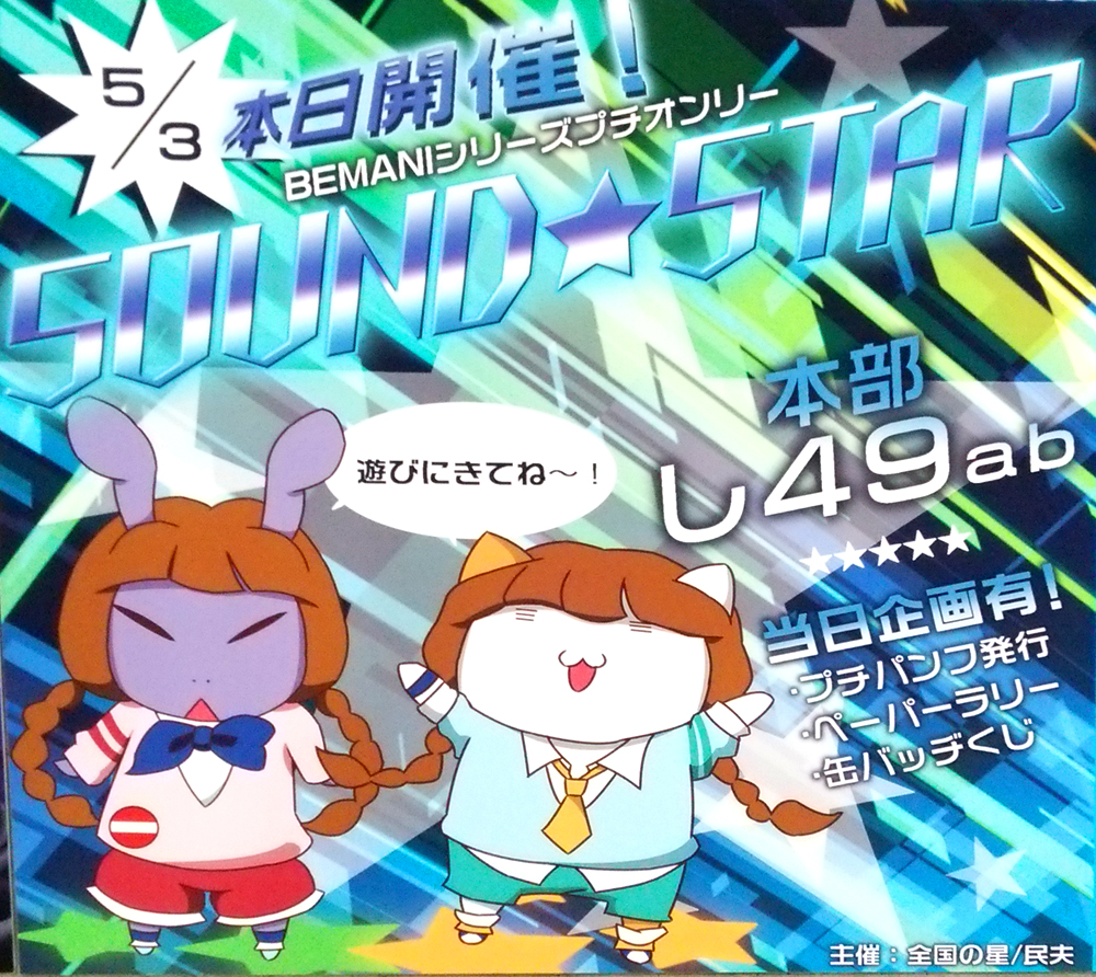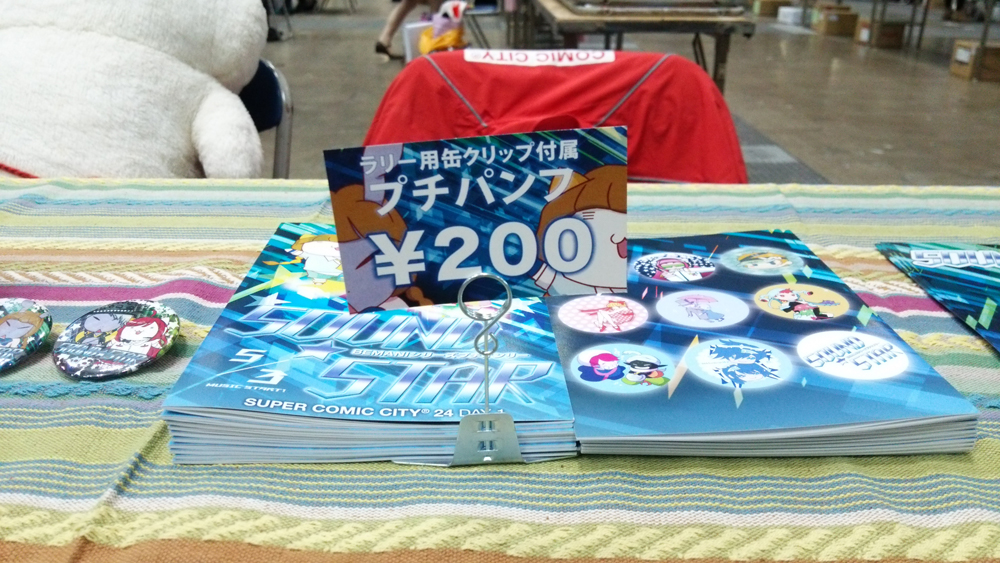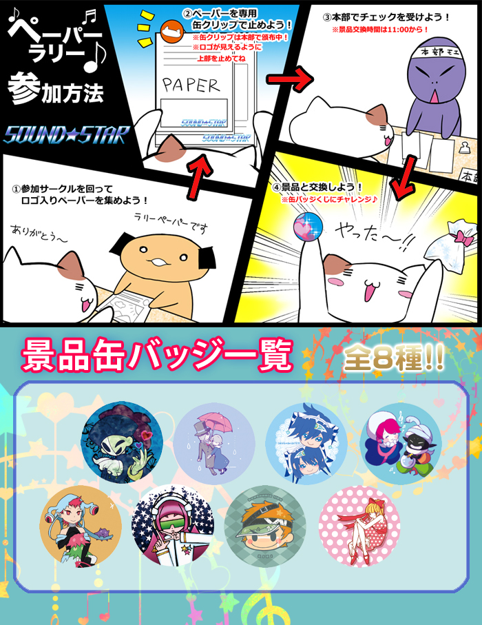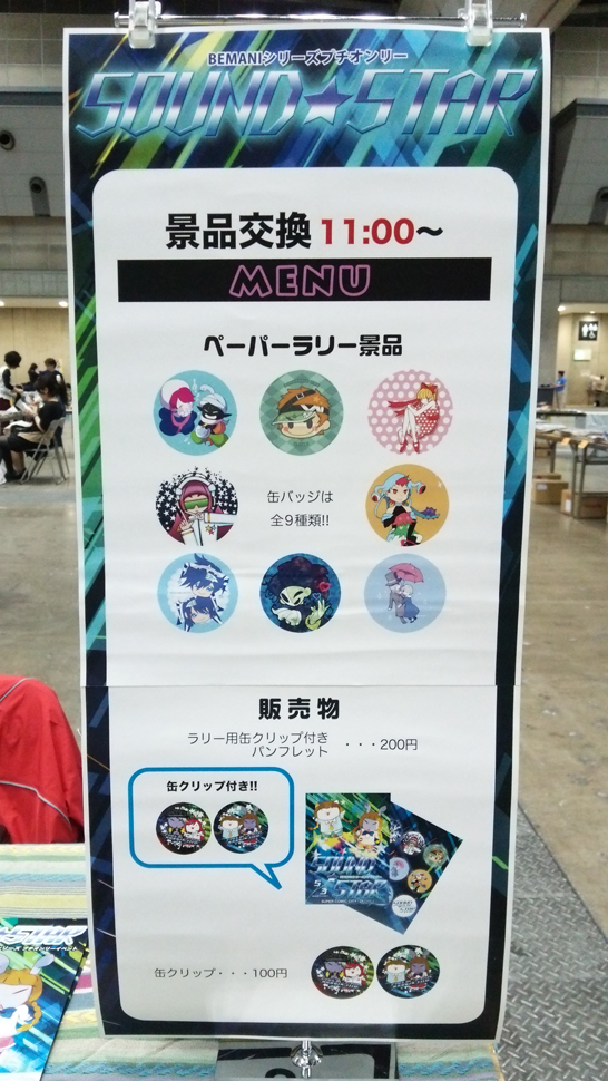当日の本部、頒布物等の写真です。サムネール画像をクリックしてご覧ください。 ※2015年3月15日のHARU COMIC CITY 20から、申請なしでのサークル入場時間のスペース撮影が可能となりました 5/3 SUPER COMIC CITY 24(東京ビッグサイト)|BEMANIシリーズプチオンリー|参加サークル数 17(16+民夫1) ◆SOUND☆STAR本部・・・プチパンフレット、缶クリップ、ラリー景品缶バッジ8種が置かれました。スペースの前面にはプチオンリー名を大きく記した垂れ幕を掲示しました。 ◆プチパンフレット・・・A5サイズ、参加サークル様からご提供いただいた缶バッジイラストを裏表紙に並べました。裏表紙にご協力頂いたサークル様の数は8!プチパンフを購入すると必ずラリー用缶クリップが付いていました。 ◆記念グッズ:ラリー用缶クリップ・・・ペーパーラリーに必須の缶クリップとしてパンフ付属と単品と、2通りの方法で頒布しました。絵柄が2種あったこともあり、記念に両方購入される方もいらっしゃいました。 ◆くじ引き・・・11:00から開始した缶バッジくじですが、みなさん早い時間から引きに来てくださいました。卓上のサークルさんの缶バッジを見て参加してくださった方も多かったです! ◆くじ引き缶バッジ・・・当日くじ引きに使用した缶バッジは、参加サークル様がイラストを提供してくださった缶バッジ計8種!どれもこれも素敵な仕上がりで、スペースで皆さんに興味を持っていただけました。ご協力いただいたサークル様に感謝を申し上げます。 ◆大看板・・・当日館内の入り口に設置されていました。 ◆民夫・・・本部には主催:民夫が座っていました。お触り自由です。興味を示される方、開催のお礼などご挨拶に来てくださる方もいらっしゃいました!ありがとうございます。 ◆BGM・・・リクエストしたBGMはリクエスト1位の「なんか変だ!」(新堂敦士/ポップンミュージック) でした! 今回のプチオンリーにご協力頂きましたすべての方にお礼申し上げます。 ありがとうございました! |