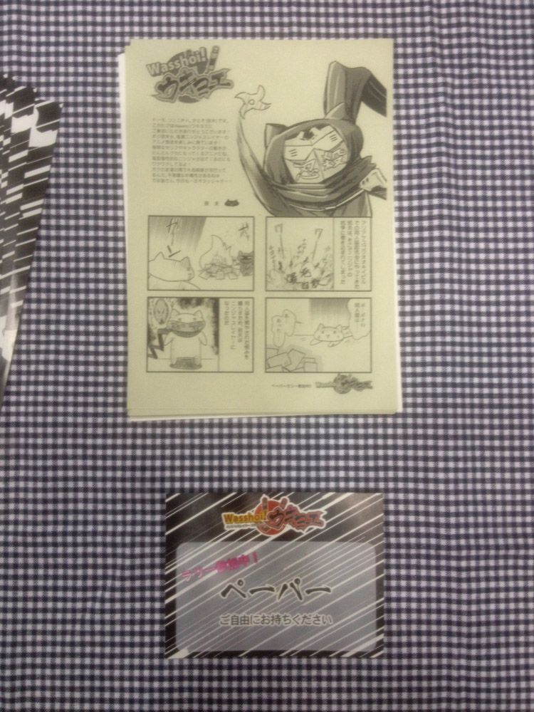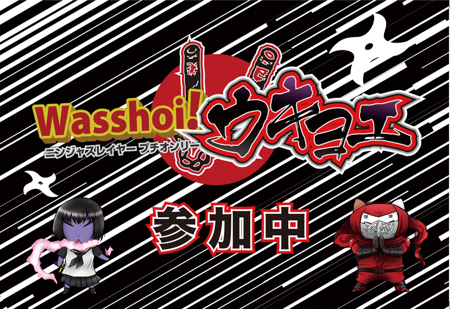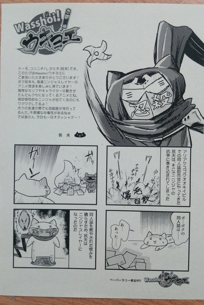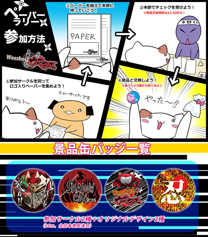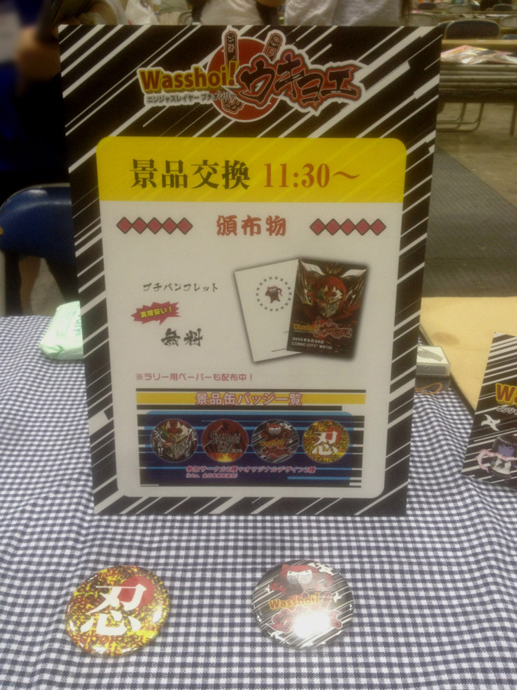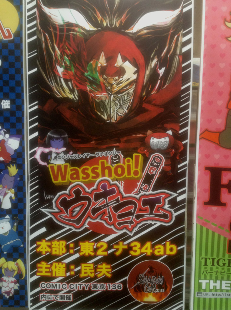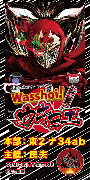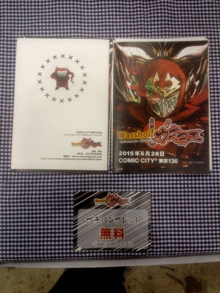 当日の本部、頒布物等の写真です。サムネール画像をクリックしてご覧ください。 6/28 COMIC CITY 東京136(東京ビッグサイト)|ニンジャスレイヤープチオンリー|参加サークル数6 (5+民夫(ホモエロ)1) ◆Wasshoi!ウキヨエ本部・・・無配プチパンフレット、ペーパー、ラリー景品缶バッジ4種が置かれました。スペースの前面にはプチオンリー名を大きく記した垂れ幕を掲示しました。 ◆プチパンフレット・・・A5サイズ、表紙には公募イラストを大きく掲載させて頂きました!プチパンフレットは無料で配布していました。 ◆ペーパー・・・「Wasshoi!ウキヨエ」では、本部でラリー用のペーパーを配布していました。民夫の近況や4コマ漫画が載っていました。 ◆くじ引き・・・11:30から缶バッジの景品交換を行いました。表からは見えない袋に入れ、カゴからひいてもらう形式で交換していました。 ◆くじ引き缶バッジ・・・当日くじ引きに使用した缶バッジは、参加サークル様がイラストを提供してくださった缶バッジ2種と、民夫が頑張ってデザインした缶バッジ2種の計4種!缶バッジイラストにご協力いただいたサークル様に感謝を申し上げます。 ◆大看板・・・当日東2ホールの入り口に設置されていました。 ◆民夫(?)・・・本部には主催:民夫(?)が座っていました。紫色のツヤツヤボディに白い民夫のお面…その正体は、赤ブーブー通信社のマスコットキャラクターその2、ホモエロでした! ◆BGM・・・今回はリクエスト頂いた楽曲が未発売またはJASRAC未登録だったため、 下記楽曲に代えさせて頂きました。ご希望に沿えず申し訳ございませんでした。 「BACK IN BLACK」(BOOM BOOM SATELLITES/アニメOP) 規模としては小さめのプチオンリーでしたが、プチのためにイベントに来て全参加サークル様を回って本やグッズを手に入れている方や、今後の公式の展開について熱く語り合ったりと濃密な時間を過ごしている方が多い印象をうけました。また普段のCITYで見かけることが少ない男性の参加者様も多く来場されました。 「Wasshoi!ウキヨエ」にご協力頂きましたすべての方にお礼申し上げます。 ありがとうございました! |