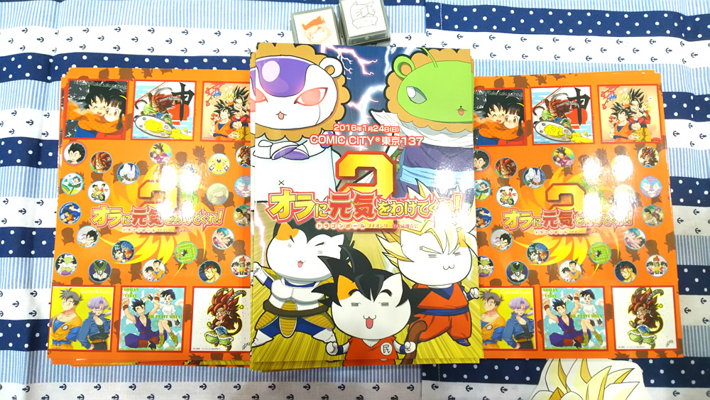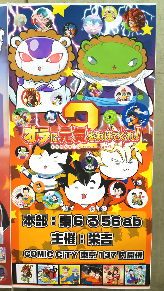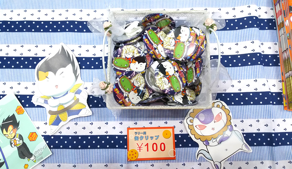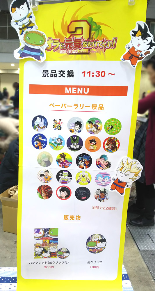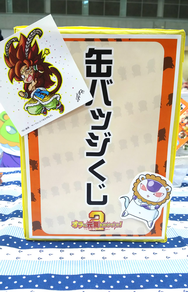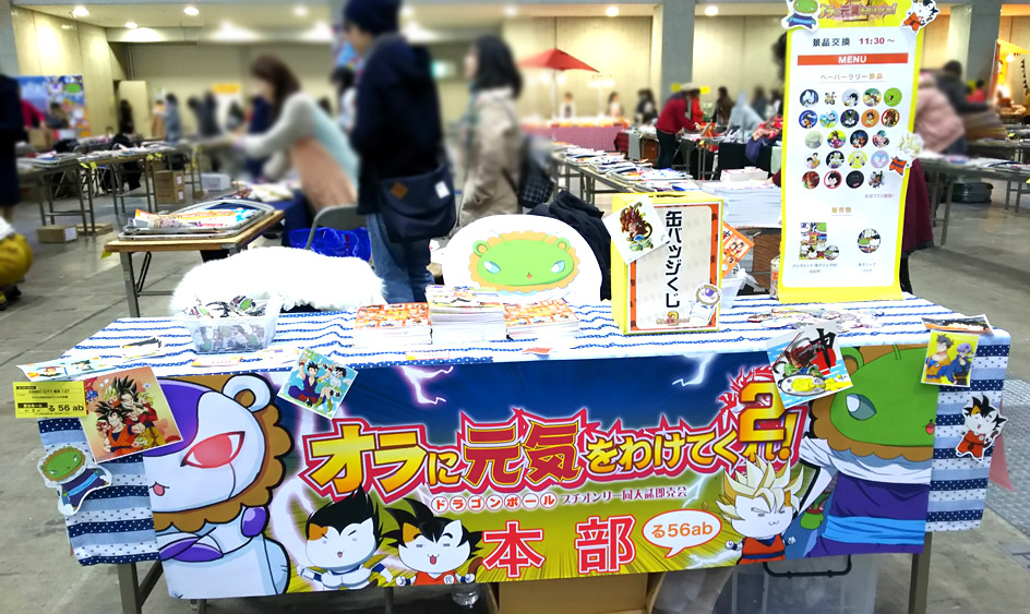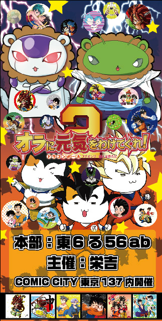 当日の本部、頒布物等の写真です。サムネイル画像をクリックしてご覧ください。 1/24 COMIC CITY 東京137(東京ビッグサイト)|オラに元気をわけてくれ!2|参加サークル数 55 ◆オラに元気をわけてくれ!2本部・・・プチパンフレット、缶クリップ、景品缶バッジ入りのくじ引き抽選箱が置かれました。スペースの前面には公募で頂いたイラストのPOPをあしらったプチオンリーの垂れ幕を掲示しました。 ◆プチパンフレット・・・A5サイズ、表紙には栄吉や民夫がドラゴンボールのキャラに扮したイラストをちりばめ、裏表紙には公募イラストと缶バッジイラストを飾りました!プチパンフを購入すると必ずラリー用缶クリップが付いてきました。 ◆ラリー用缶クリップ・・・ペーパーラリーに必須の缶クリップとしてパンフ付属と単品と、2通りの方法で頒布しました。栄吉と民夫があしらわれたデザインです。 ◆景品【缶バッジ】・・・参加サークル様がイラストを提供してくださったドラゴンボールの缶バッジは全22種!抽選箱から引く形式で配布しました。前回から引き続き多くのご協力を頂きました。ご提供いただいたサークル様に感謝を申し上げます。 ◆くじ引き・・・11:30から開始したペーパーラリーの缶バッジくじ引きは、枚数集めるごとに何回も挑戦しに来てくれる方が多い印象でした。何十枚と集める猛者も!お目当てのキャラクターの缶バッジが出ると皆さん手放しで喜んでいました。 ◆大看板・・・当日は東6ホール内に設置されていました。栄吉・民夫と公募イラスト、缶バッジイラストをちりばめて作成されています。 ◆告知チラシ・・・開催までにプチオンリー告知チラシを配布していました。チラシ配布にご協力いただいたサークル様に感謝を申し上げます! ◆エア新刊ジャック・・・エアプロジェクトコーナーは、東6ホールに設置されていました。ドラゴンボールのエア新刊が投稿されていました! ◆プチ本部・・・本部には主催:陽水が座っていました。今回は全身を緑色に染め上げて気合の入ったコスプレで挑みました。 ◆BGM・・・リクエストしたBGMは「F」(マキシマム ザ ホルモン/劇場版 ドラゴンボールZ 復活の「F」挿入歌)でした! 今回は前回開催から少し短い間隔で開催したため、また参加者様に来ていただけるのか懸念されましたが、そんな心配を吹き飛ばす勢いの盛り上がりでした。 前回から引き続きご参加の方も多く、サークル同士の交流が活発な印象を受けました。 本部の栄吉へ労いの言葉や、差し入れも多く頂きました。本当にありがとうございました。 今回のプチオンリーにご協力頂きましたすべての方にお礼申し上げます。 ありがとうございました! |